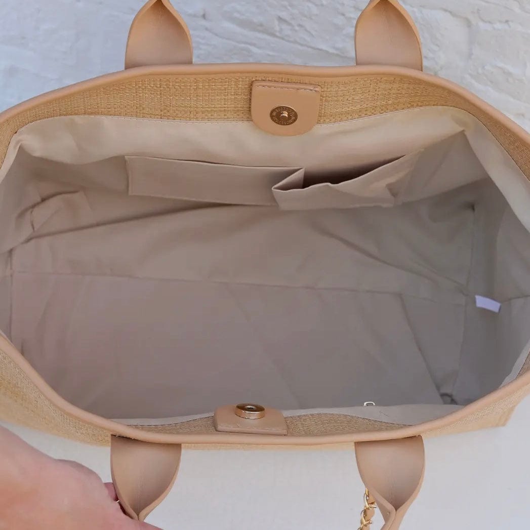 This oversized lattice straw tote is the best go-to handbag! It has two short top handles as well as two elongated braided handles to carry on your shoulder. The Caroline Hill logo is centered at the top of this bag on one side. It has a magnetic closure leading to the roomy interior of the bag. It has one zippered pocket and two open pockets inside. There are also feet on the bottom of the bag for added protection. It's the perfect size for travel, carrying a laptop, or for everyday fashion.