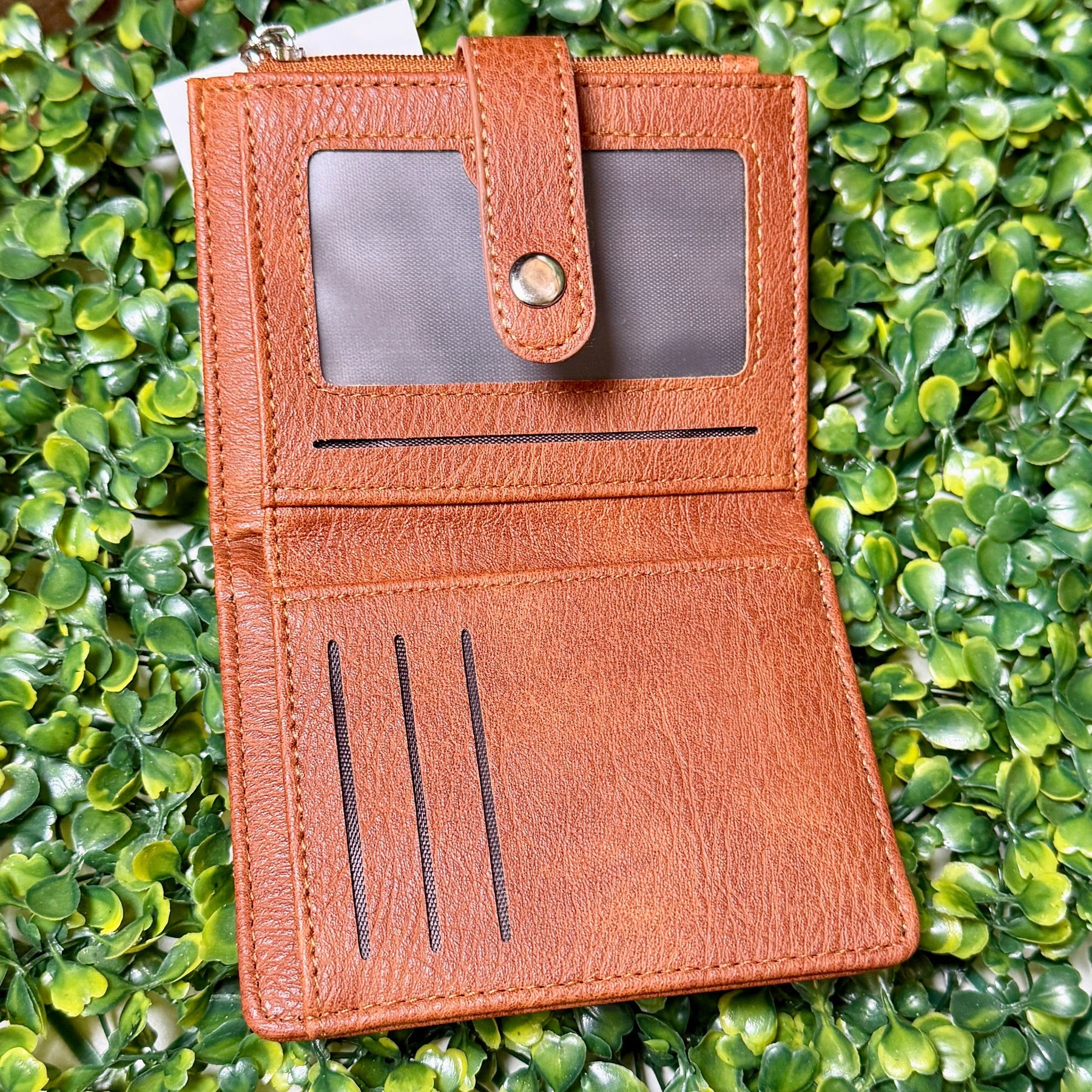 Small wallet, place for credit cards, snap closure and a place to put your dollar bills.