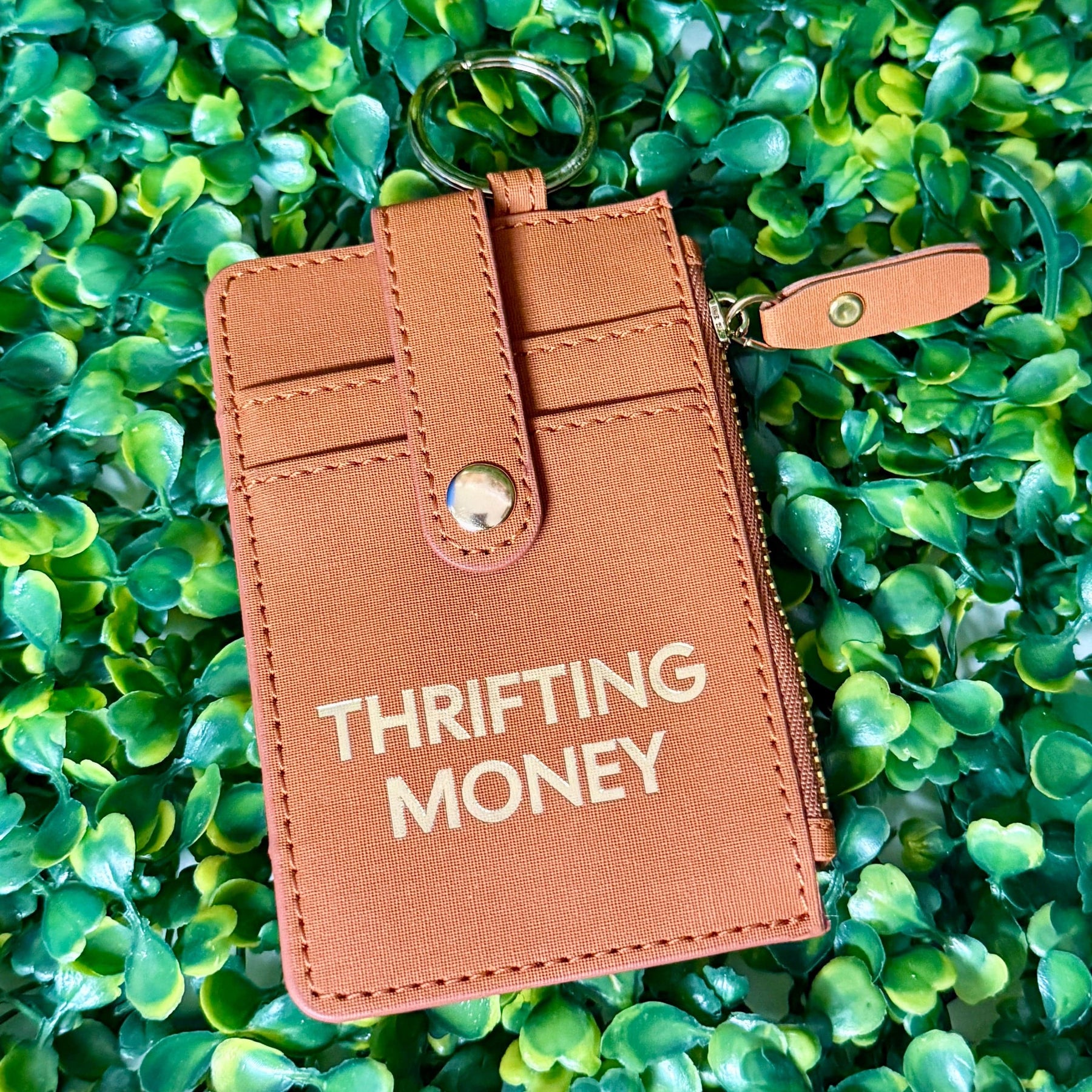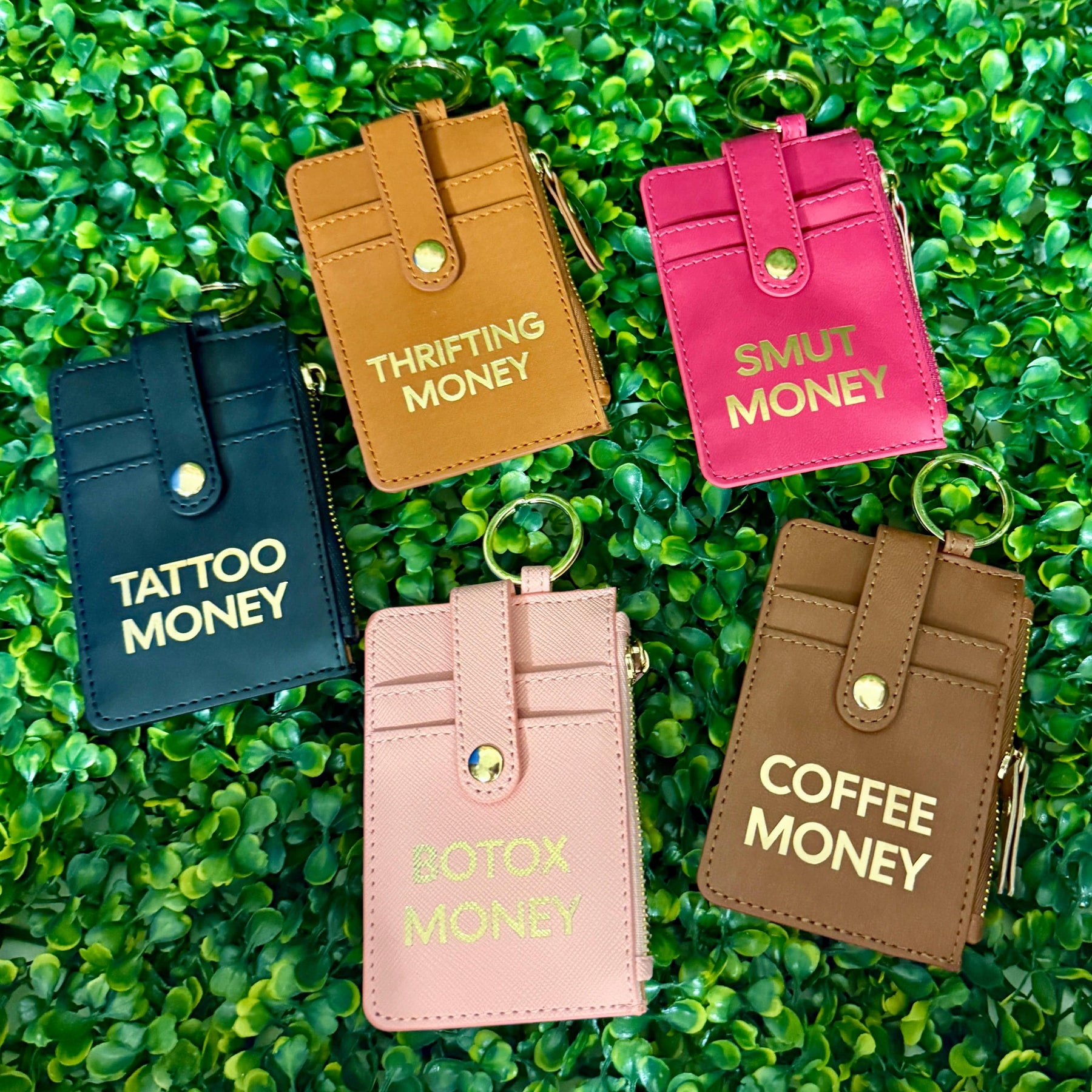 Crafted from durable PU leather, the Vice Wallet/Keychain offers a compact, stylish solution for organizing your essentials. Measuring 2.75" x 4.25", it features gold foil text on the front, two card slots secured with a snap closure, a zippered compartment for cash and coins, plus two additional card slots on the back. This sleek design ensures your favorite little vice stays close and secure while complementing your everyday carry with expert functionality and refined aesthetics.
