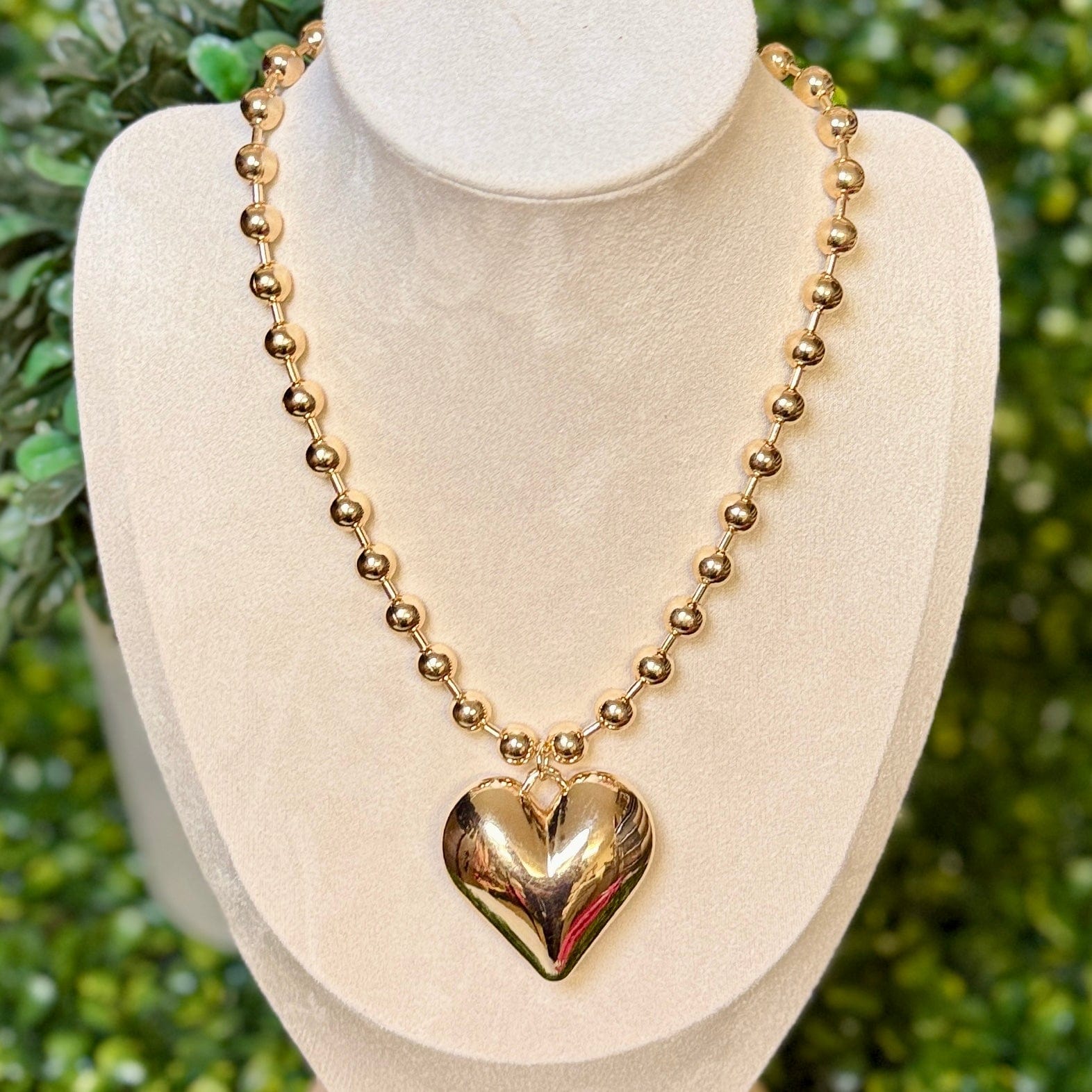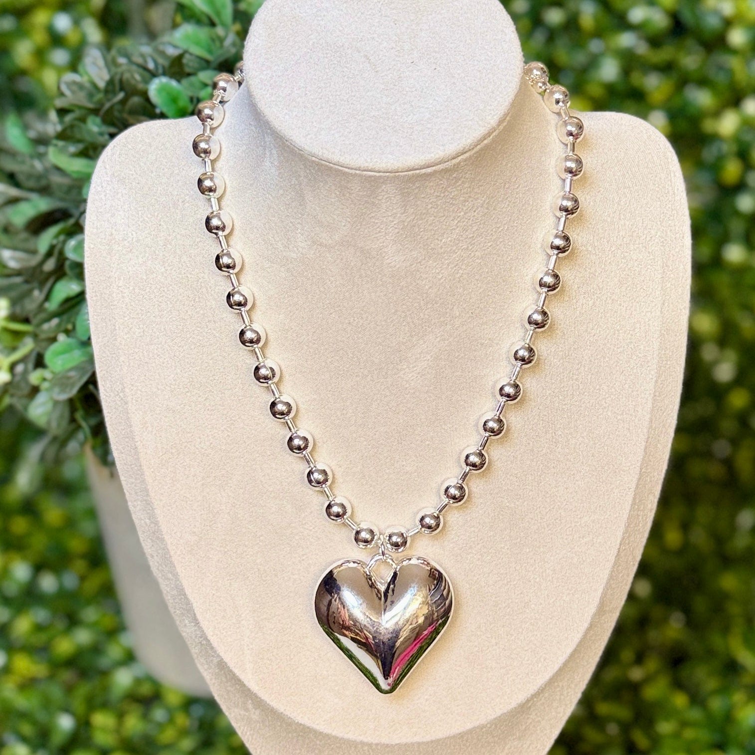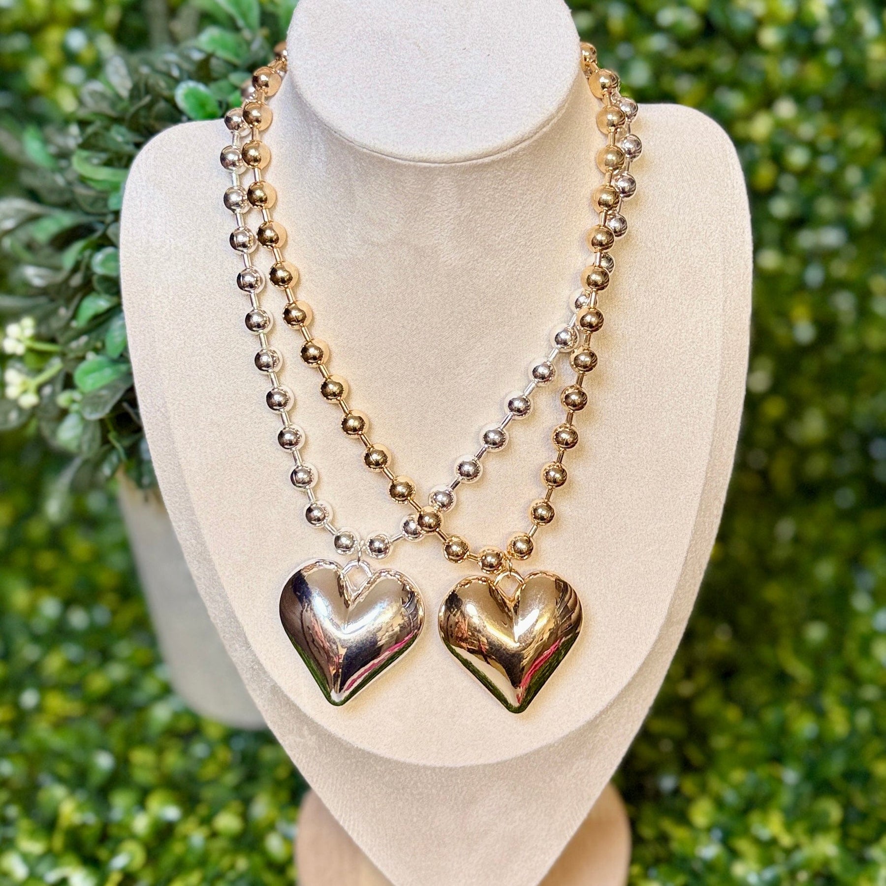Elegant puffed heart necklace available in gold or silver finishes. Features a delicate beaded chain with a 2-inch extender for customizable length. This versatile piece offers dimensional heart styling that complements both casual and formal attire.