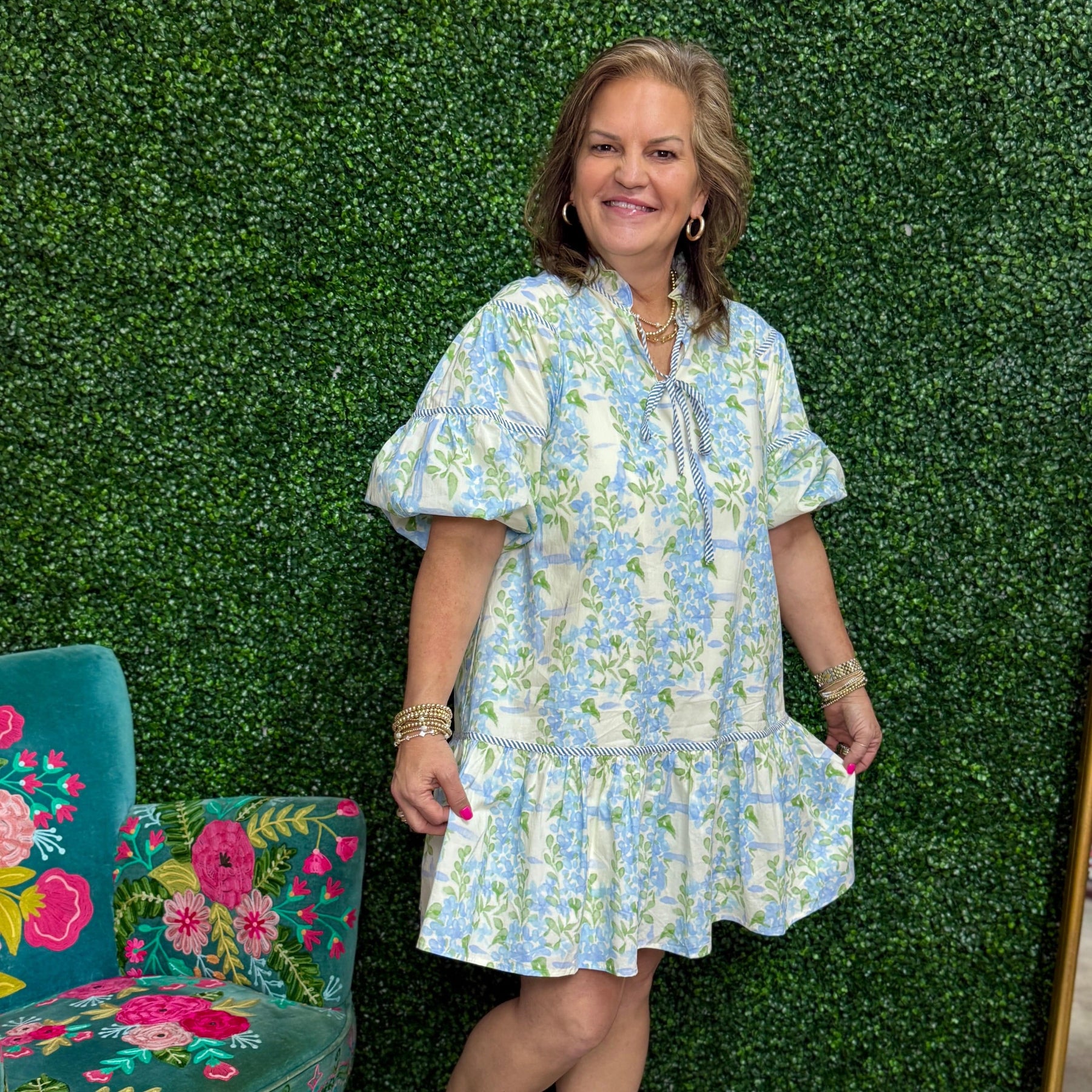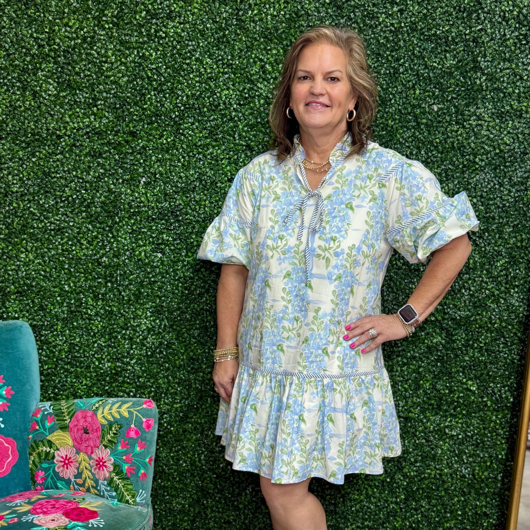 Introducing our In Full Bloom Dress, the perfect blend of comfort and style. This relaxed baby doll dress features a tassel tie v neck, ruffled hemline, and puff sleeves. Stay on-trend and comfortable with this stylish dress.