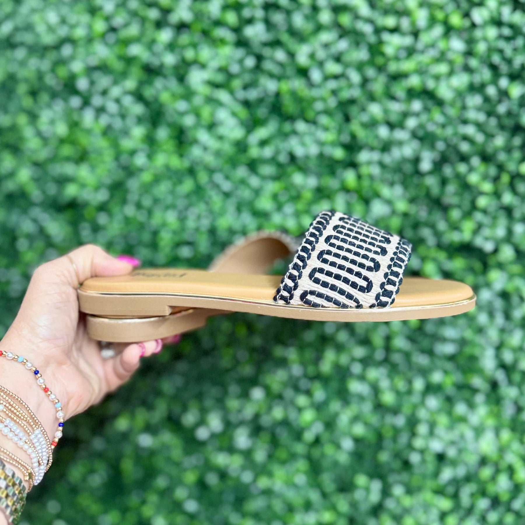 The Here For A Goodtime Sandal in Black offers a sophisticated blend of boho charm and bold style. Featuring a woven band in black and natural tones, this flat sandal delivers versatile elegance that complements white linen, dark denim, or flowy prints. Designed for both comfort and lasting wear, it’s an expert choice for effortless, stylish looks.