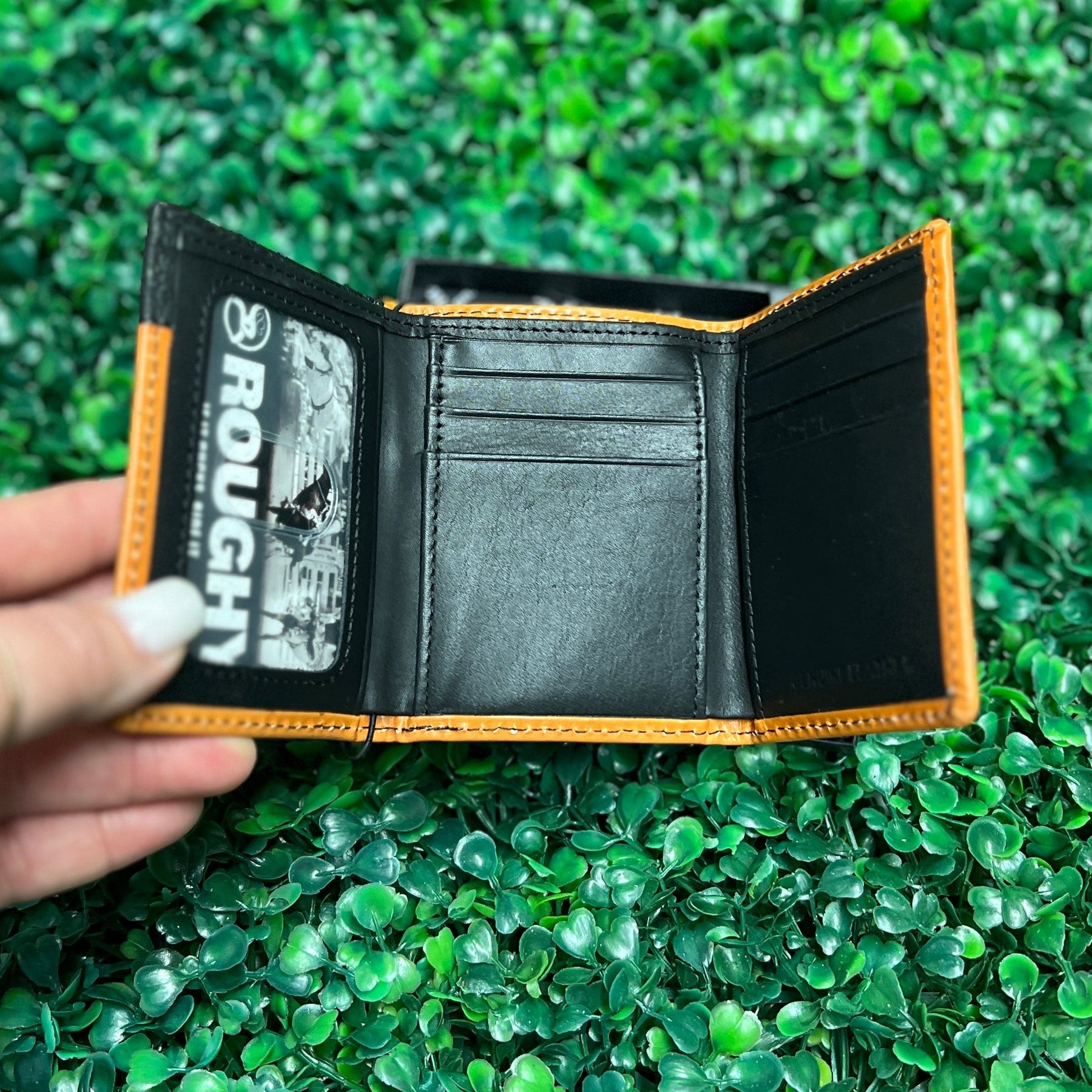 This Roughy trifold wallet features hand-tooled leather with red inlay, black bullhide overlay and roughy 1872 concho and includes our custom hooey brands woven logo liner.