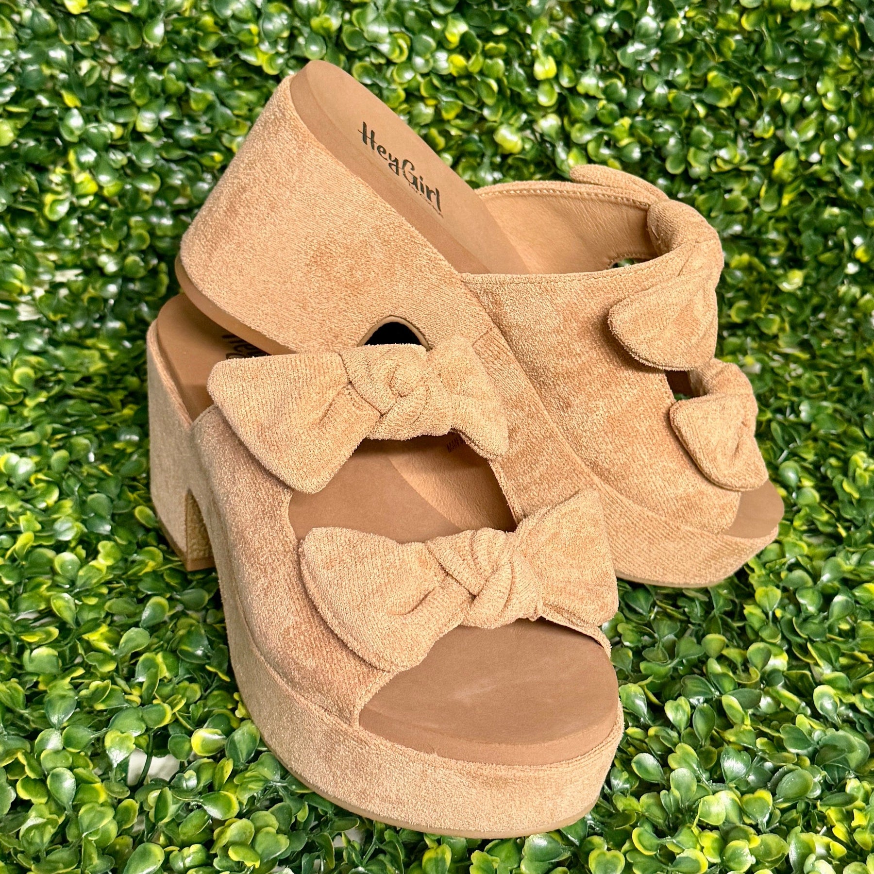 Elevate your look with the Put A Bow On It Sandals in camel. These platform mules combine retro style and modern comfort, featuring soft faux suede and distinctive double bow accents. The chunky block heel with a stable platform sole adds a confident lift, while the cushioned insole ensures all-day comfort. Designed for easy slide-on wear, they run true to size—consider sizing up if between. With an approximate 3-inch heel and 1-inch platform, these sandals offer both charm and support for versatile wear.