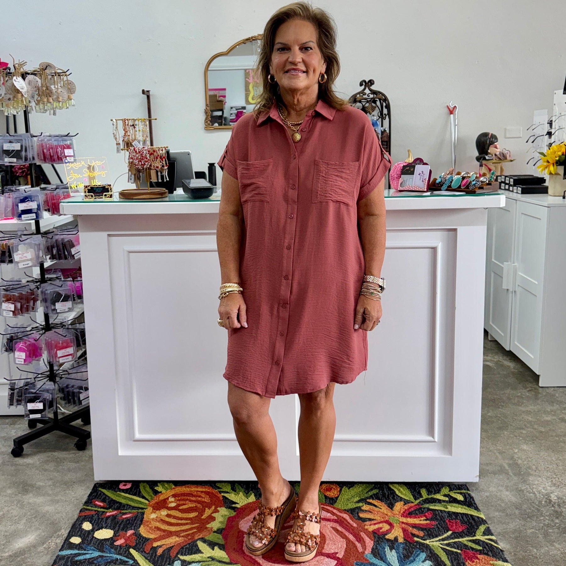 This woven tee shirt dress in a warm cinnamon hue features a relaxed drop shoulder design and a classic button-up front for an effortlessly polished look. Practical side pockets add convenience without sacrificing style. Its breathable fabric and easy silhouette make it ideal for all-day comfort while maintaining expert-level sophistication.