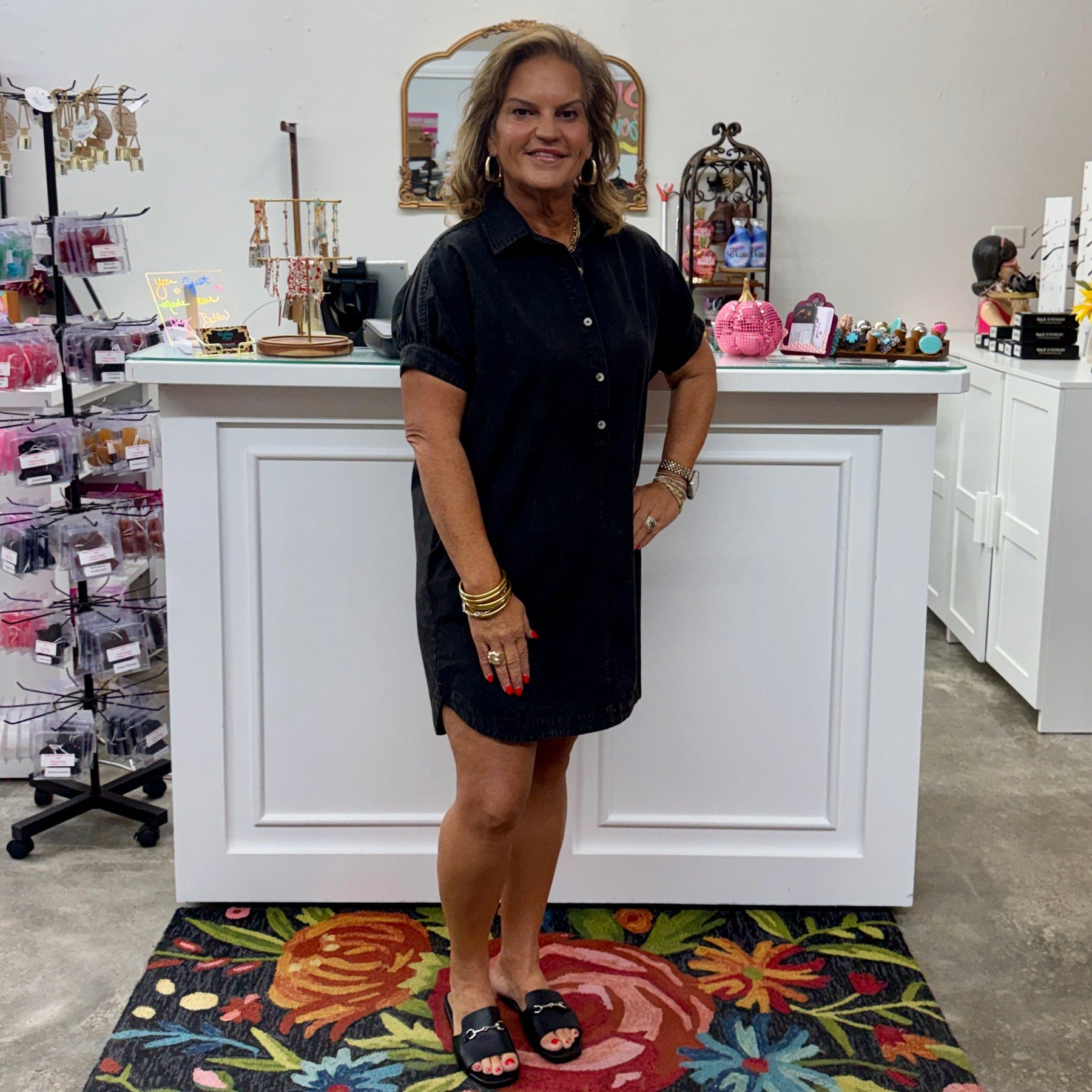The Best Shirt Dress in Black combines comfort and style with its mineral-washed fabric and relaxed fit. Designed with a collared neckline and a half button placket, this dress offers a polished yet effortless look. Gathered short sleeves with button tabs add adjustable detail, while side pockets provide practical convenience. The subtle curved hem enhances its casual, lived-in appeal, making it a versatile piece for everyday wear.