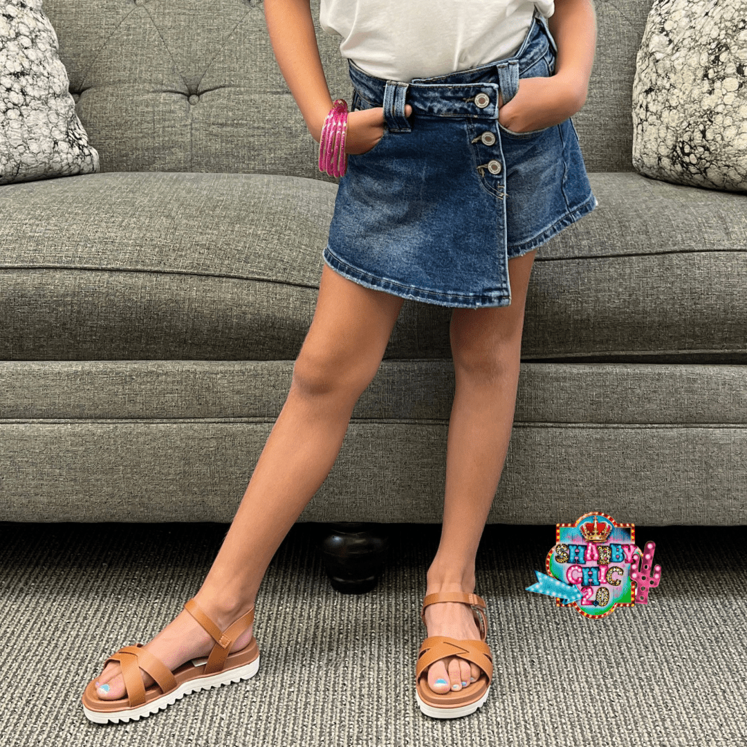 Durable and comfortable, this children's denim skort features a cross over waistband and five pocket style for a secure fit. The comport stretch ensures your kids move with ease, while the inner elastic with button closure keeps everything secure. Perfect for active and fashion-forward youngsters.