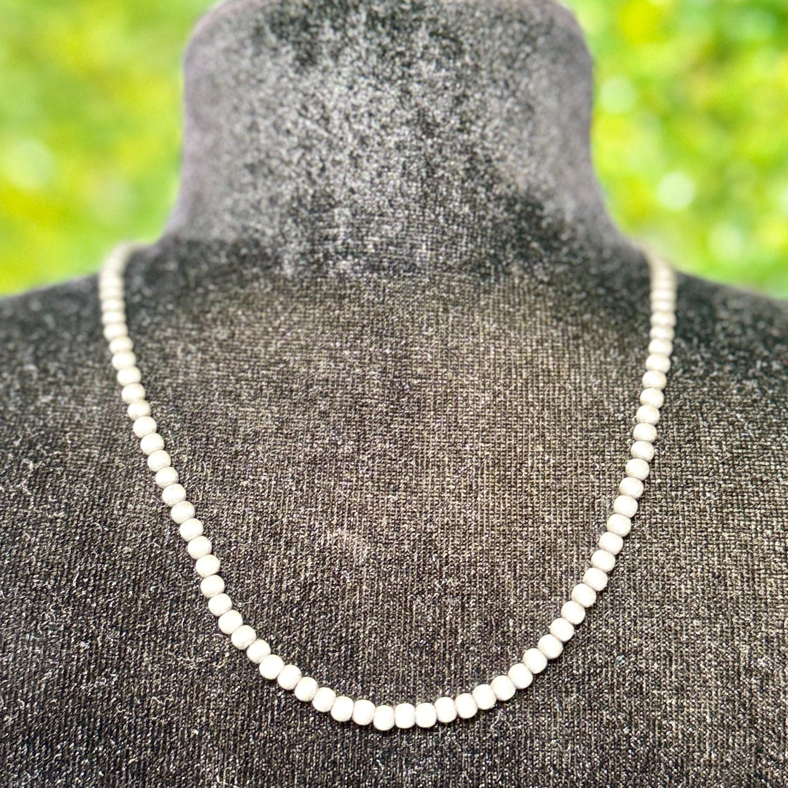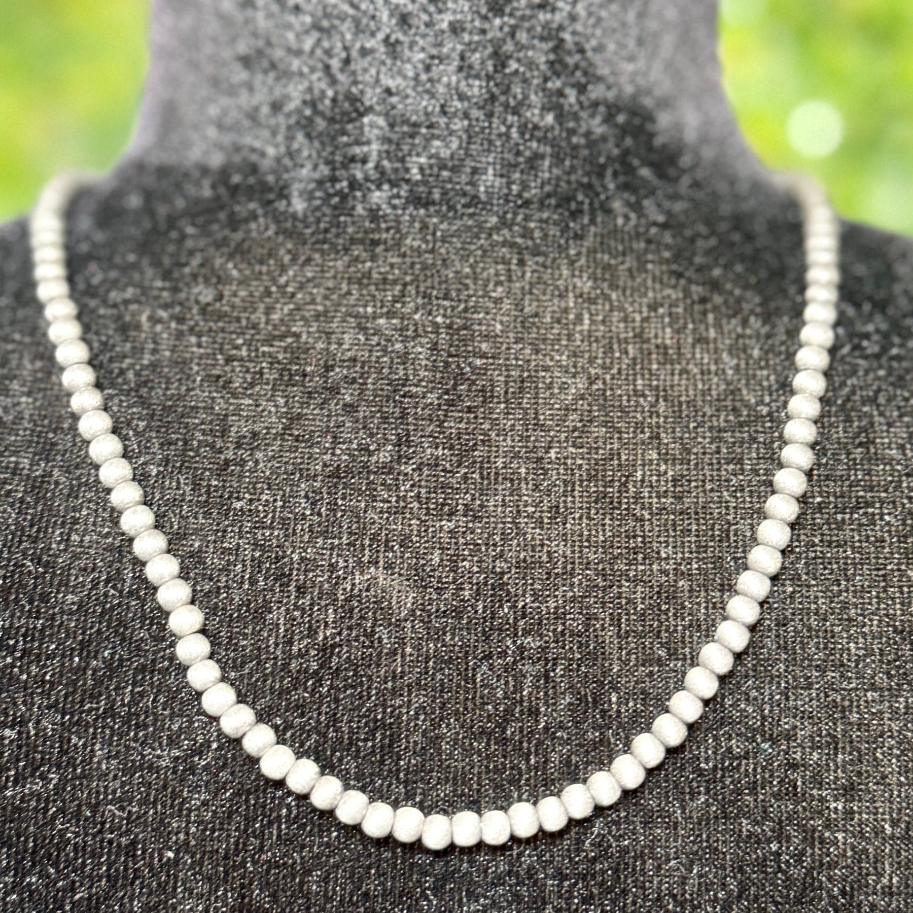This 4mm Faux Navajo Pearl Necklace offers a classic look with a modern twist. Measuring 16 inches in length and featuring a 2-inch extender, it provides versatile wearability to suit various necklines. Crafted to mimic the distinctive style of Navajo pearls, this piece adds a refined, southwestern-inspired elegance to any outfit without the high cost of genuine pearls. Ideal for layering or wearing alone, it combines timeless appeal with expert craftsmanship.