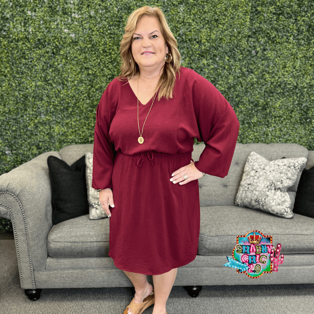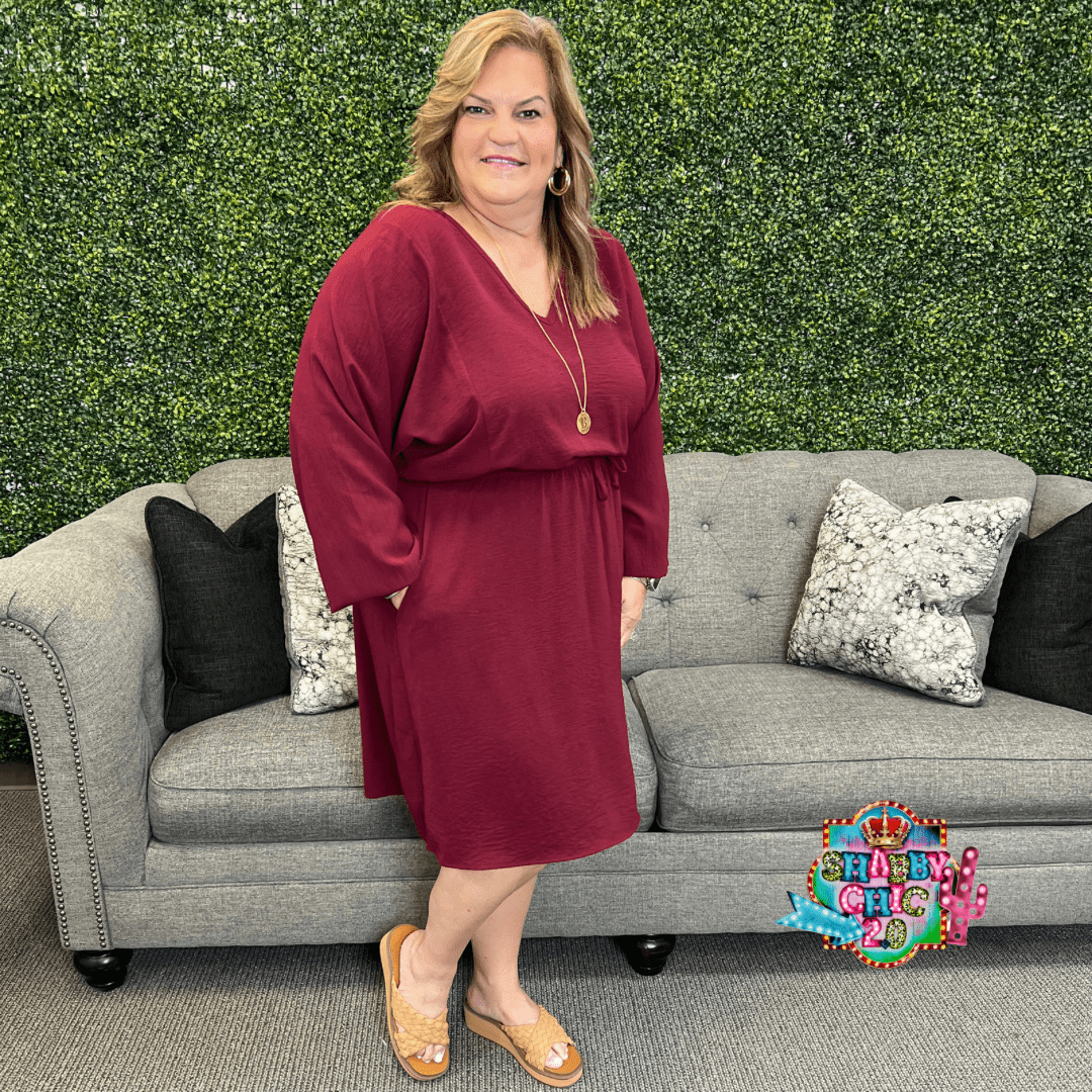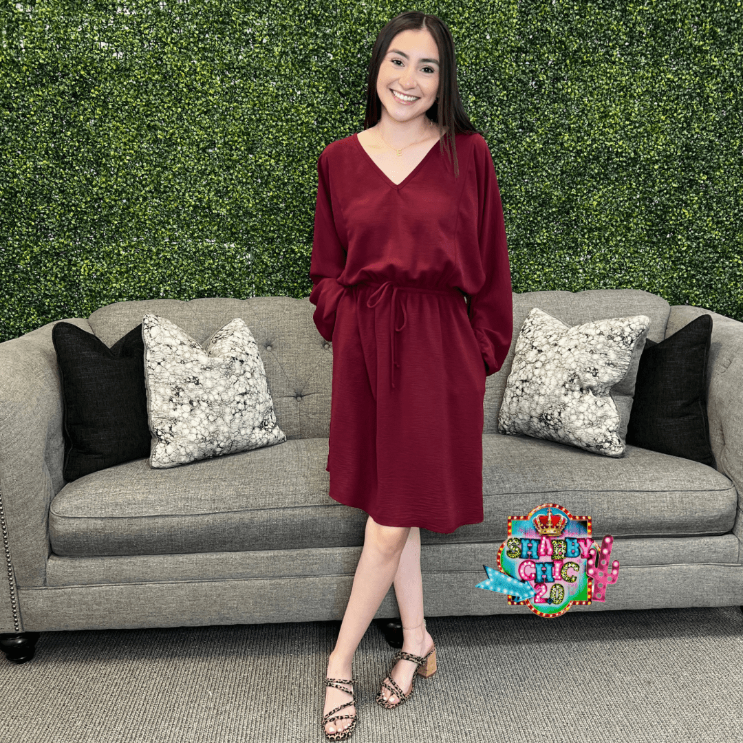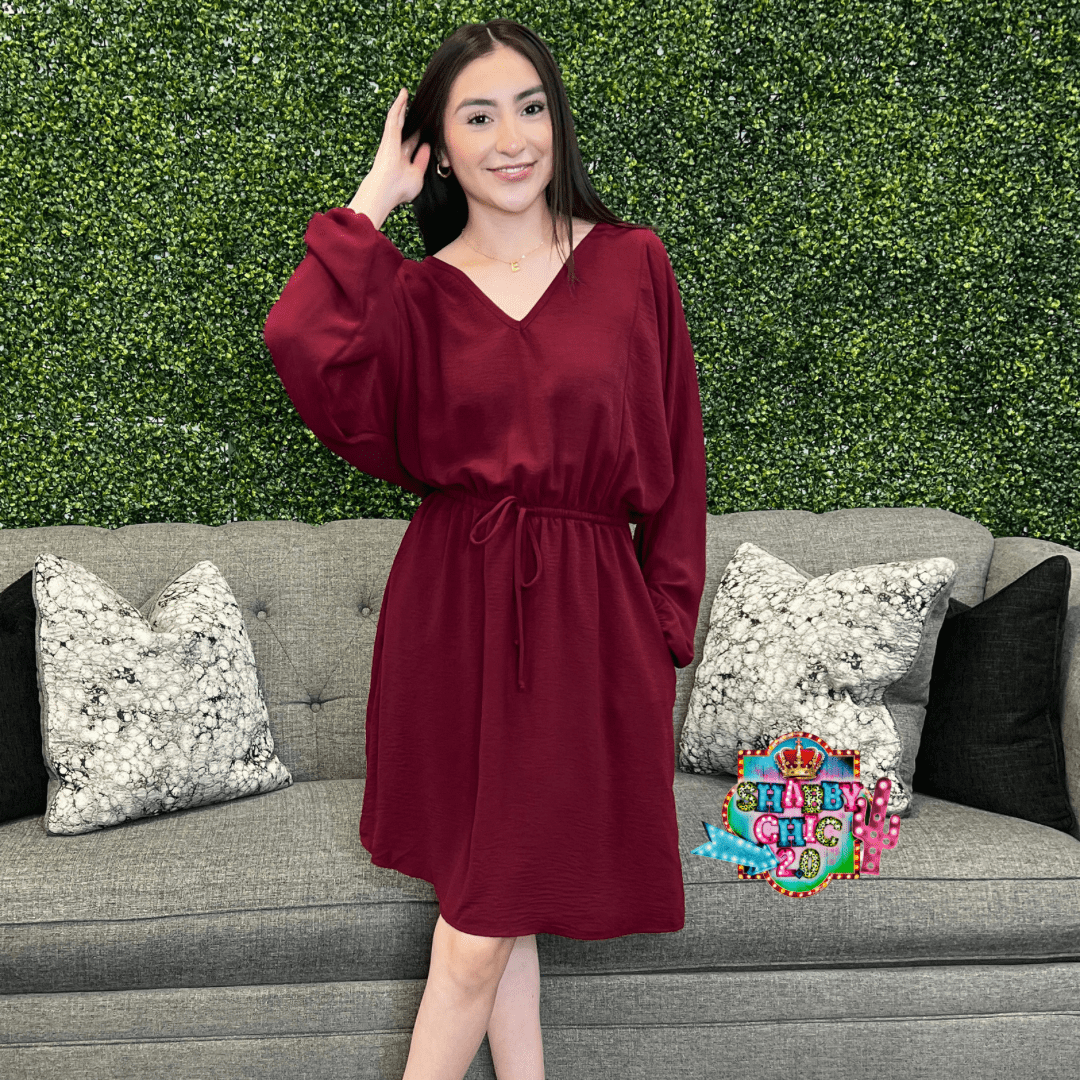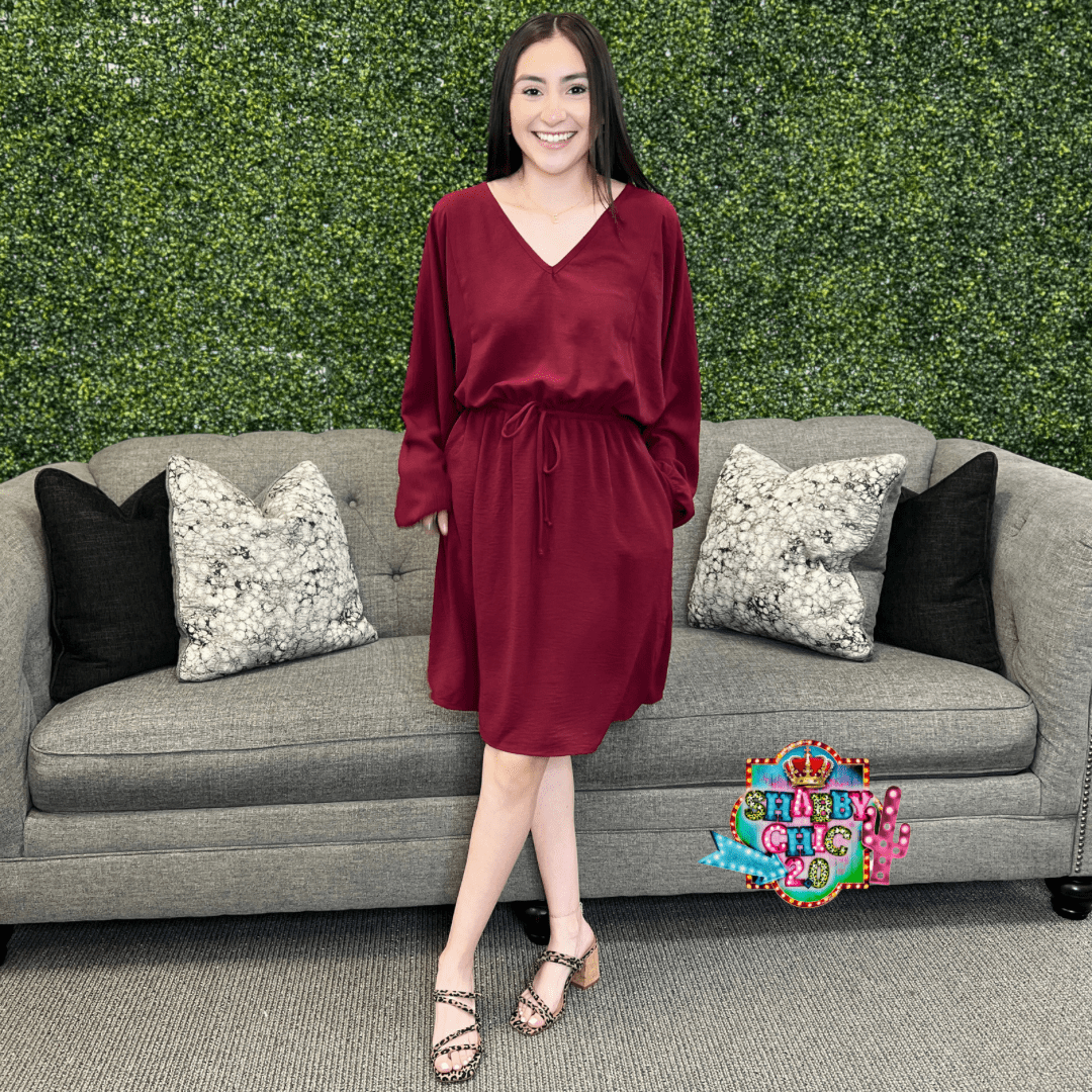 This sleek, maroon dress features long dolman sleeves, a V-neck, and a waist drawstring with side pocket detail. Crafted from lightweight fabric, it provides a comfortable, snug fit perfect for any occasion.