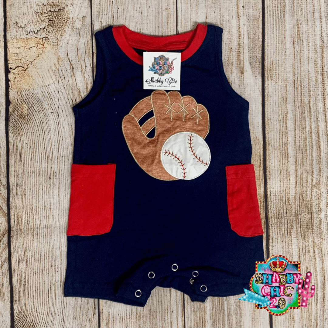 Cute onesie with baseball glove and ball applique on front. pockets on side and snap closure on bottom.