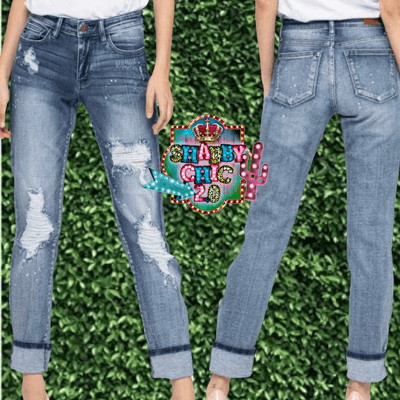Boyfriend Fit Bleach Splash Distressed Mid Rise Jeans