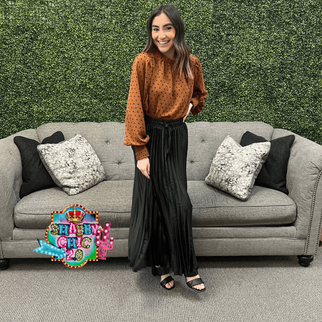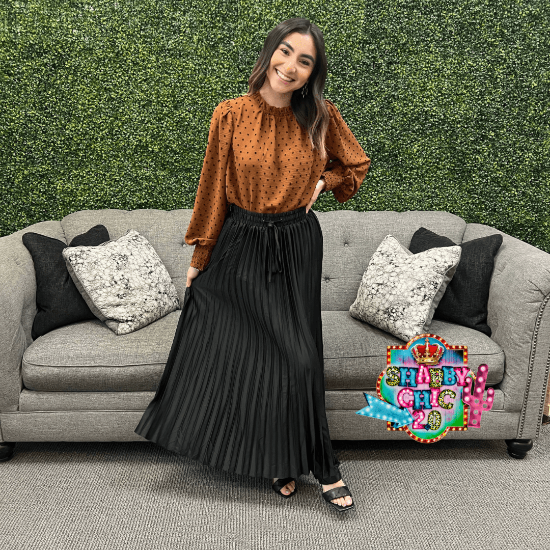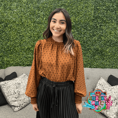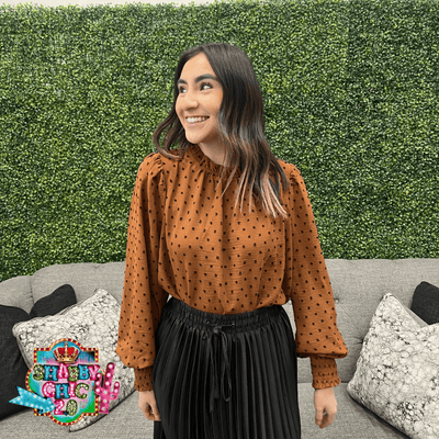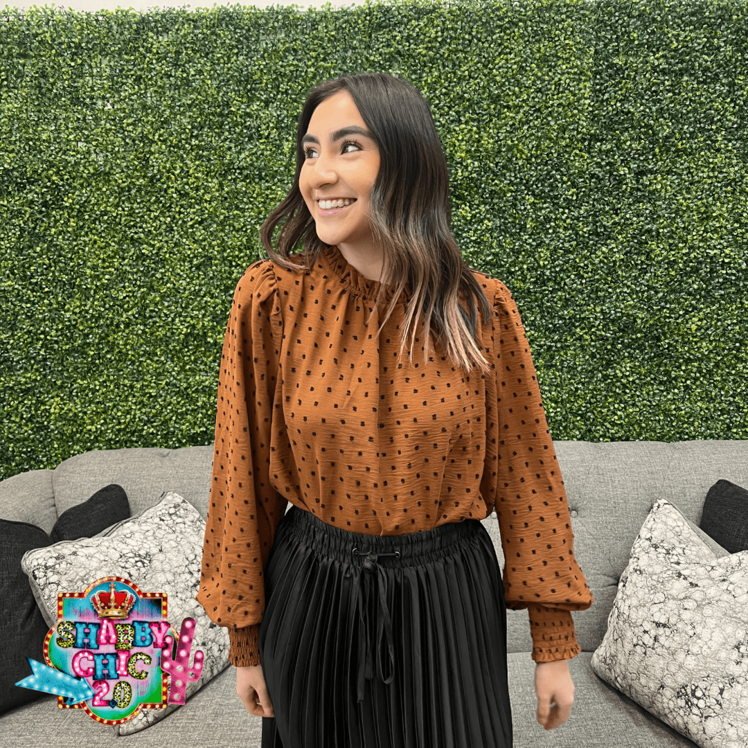 Swiss dot pattern top with a frill mock neckline, back key hole, and long puffed sleeves with smocked cuffs. Unlined, non-sheer, lightweight.