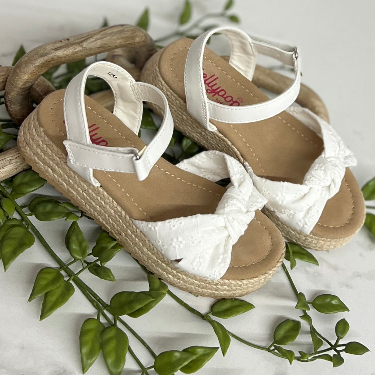 Expertly designed for young fashionistas on the go, the Children's Ella White Eyelet Wedge Sandal boasts a stylish cross-strap design and velcro closure for a secure fit. Combining both fashion and function, these wedges are perfect for any occasion.