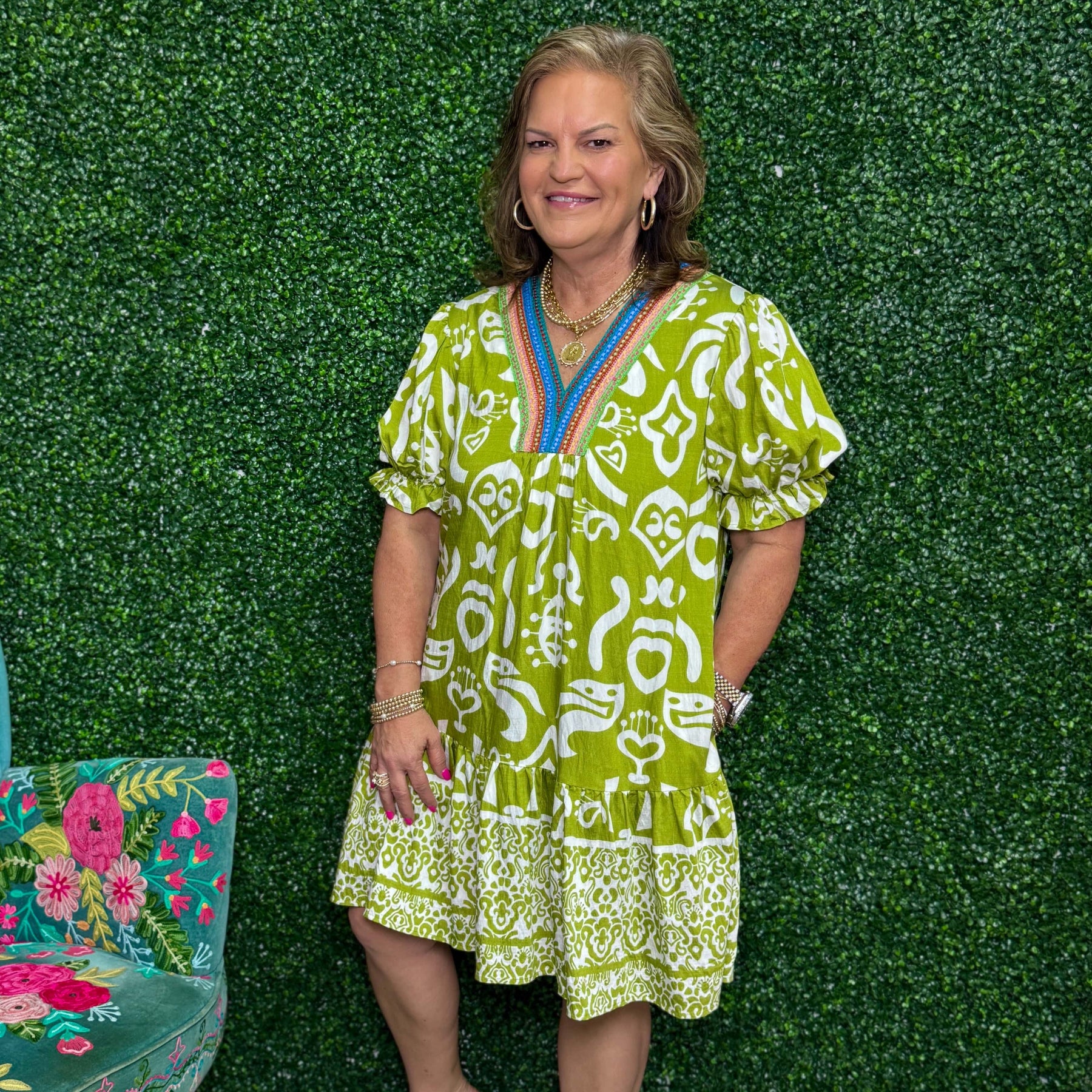 Expertly crafted with a unique green abstract print, this woven mini dress features playful puff sleeves, a flattering V-neck, and a collared patch design. With the added convenience of pockets, this dress is both stylish and functional. Perfect for any occasion, add a touch of whimsy to your wardrobe.