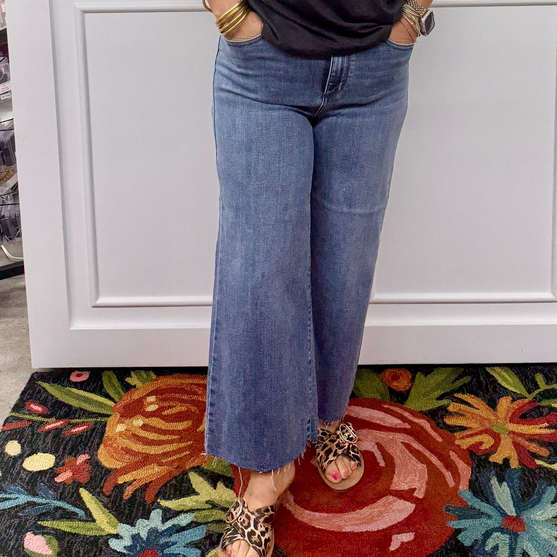 These Judy Blue High Waist Wide Leg Crop Raw Hem Jeans feature a wide leg fit that begins to flare from the mid-thigh, creating a relaxed silhouette down to the wide leg opening. Designed with a high waist for a flattering shape, the cropped length and raw hem add a modern, edgy touch. Ideal for those seeking both comfort and style, these jeans offer a versatile option that pairs well with various tops and footwear.