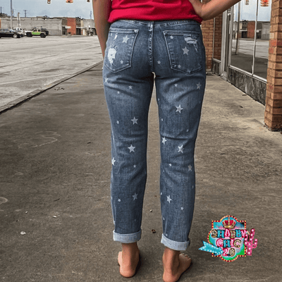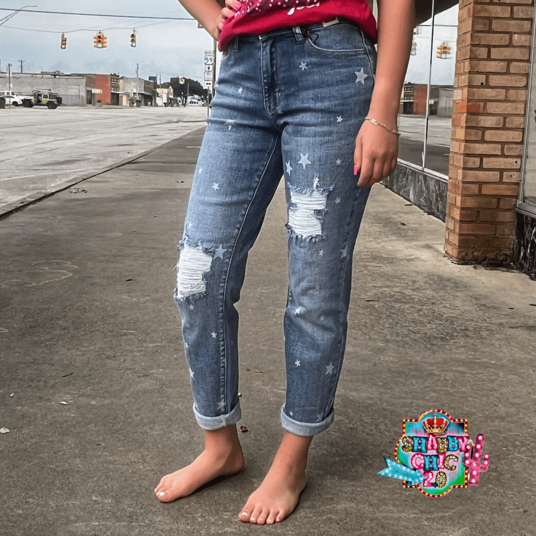 Judy Blue's Mid Rise Star Crossed Distressed Cuff Jeans in boyfriend fit offer a unique combination of style and comfort. This cuffed denim jeans features a mid-rise style with a custom star-crossed design. The destroyed detailing adds rock-and-roll flair, making these jeans both durable and chic. Ideal for any casual look.