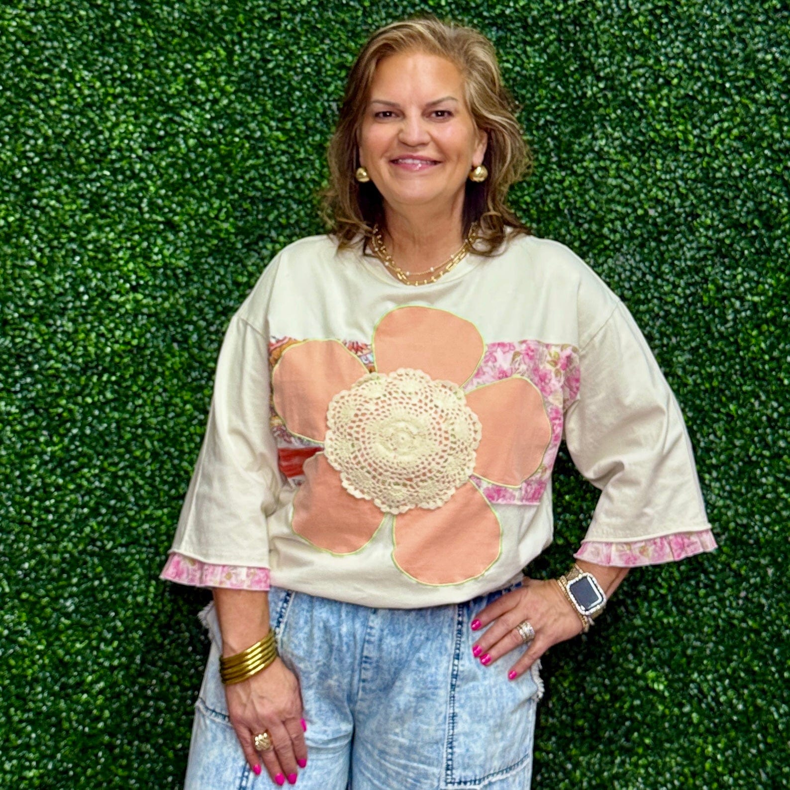 Expertly crafted with oversized fit and spring floral applique, our Ladies Oversized Crochet Flower Top features a stunning crochet doille in the center for a touch of elegance. Elevate your wardrobe with this unique and stylish top.