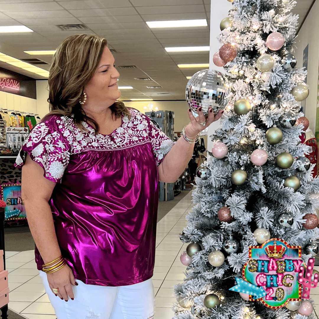 Named after the Queen herself Mrs. Dolly Parton, it only seemed fitting. If I knew her address I would send her one of these beauties. The pink metallic fabric is STUNNING and sure to be all the talk of your holiday parties and even into Valentine's Day! Pair this beauty with your favorite leather pants, jeans or white trousers and you are set to be fabulous!