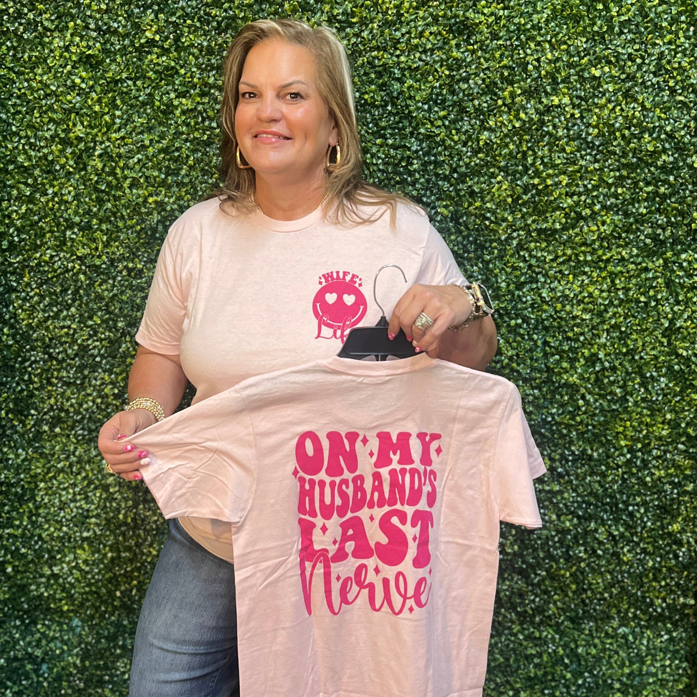 Expertly crafted to fit true to size, the On My Husband's Last Nerve Tee adds a dose of fun to your wardrobe. With its perfect fit, this tee guarantees a comfortable wear while making a statement. Say goodbye to ill-fitting tees and hello to effortless style.
