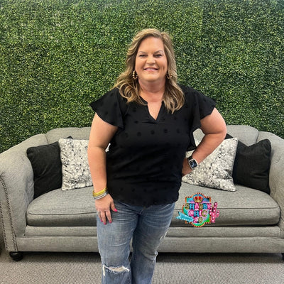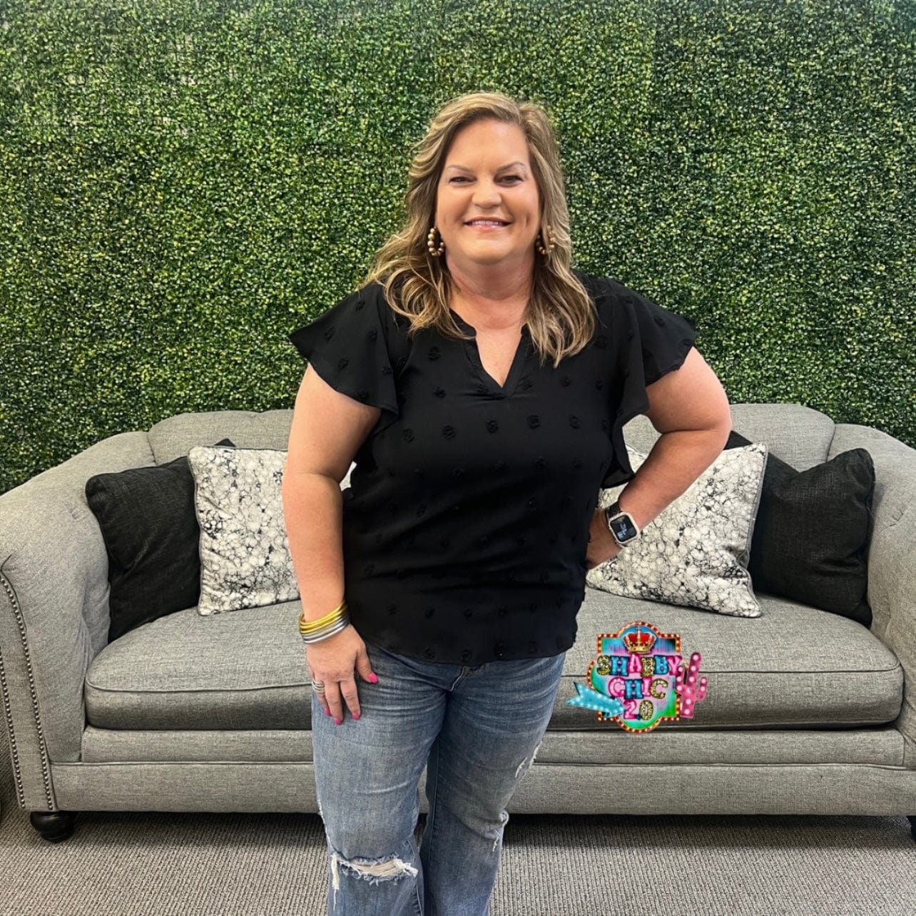 Stay classy and comfortable in our On The Same Path Top. This timeless piece features a black Swiss dot fabric with flutter sleeves and notch detail at the neckline. Unlined and effortlessly chic, this top will pair perfectly with any bottom of your choice.