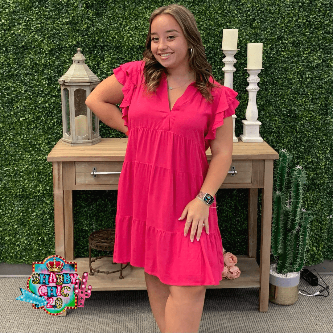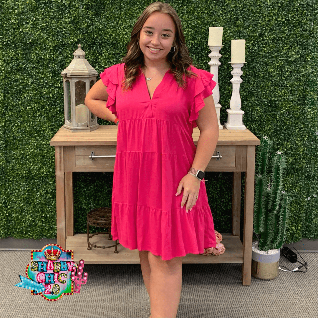 Gorgeous hot pink dress with ruffled sleeves. Perfect for any occasion. Light weight and simple.