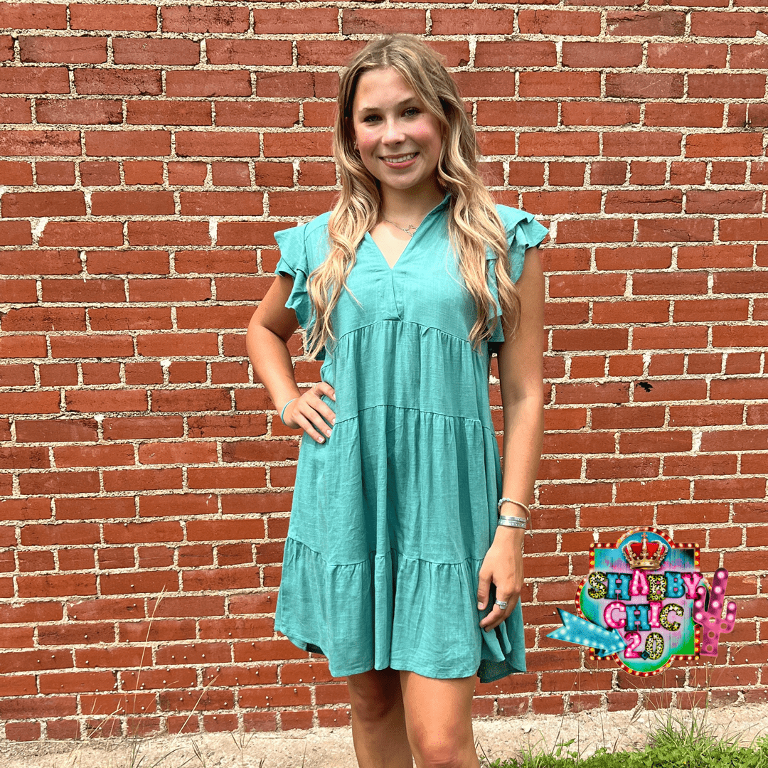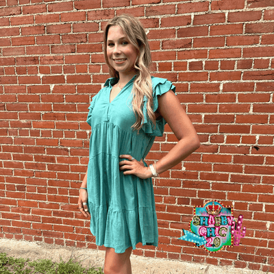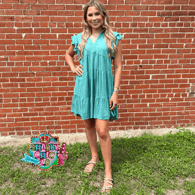 Gorgeous turquoise dress with ruffled sleeves. Perfect for any occasion. Light weight and simple.
