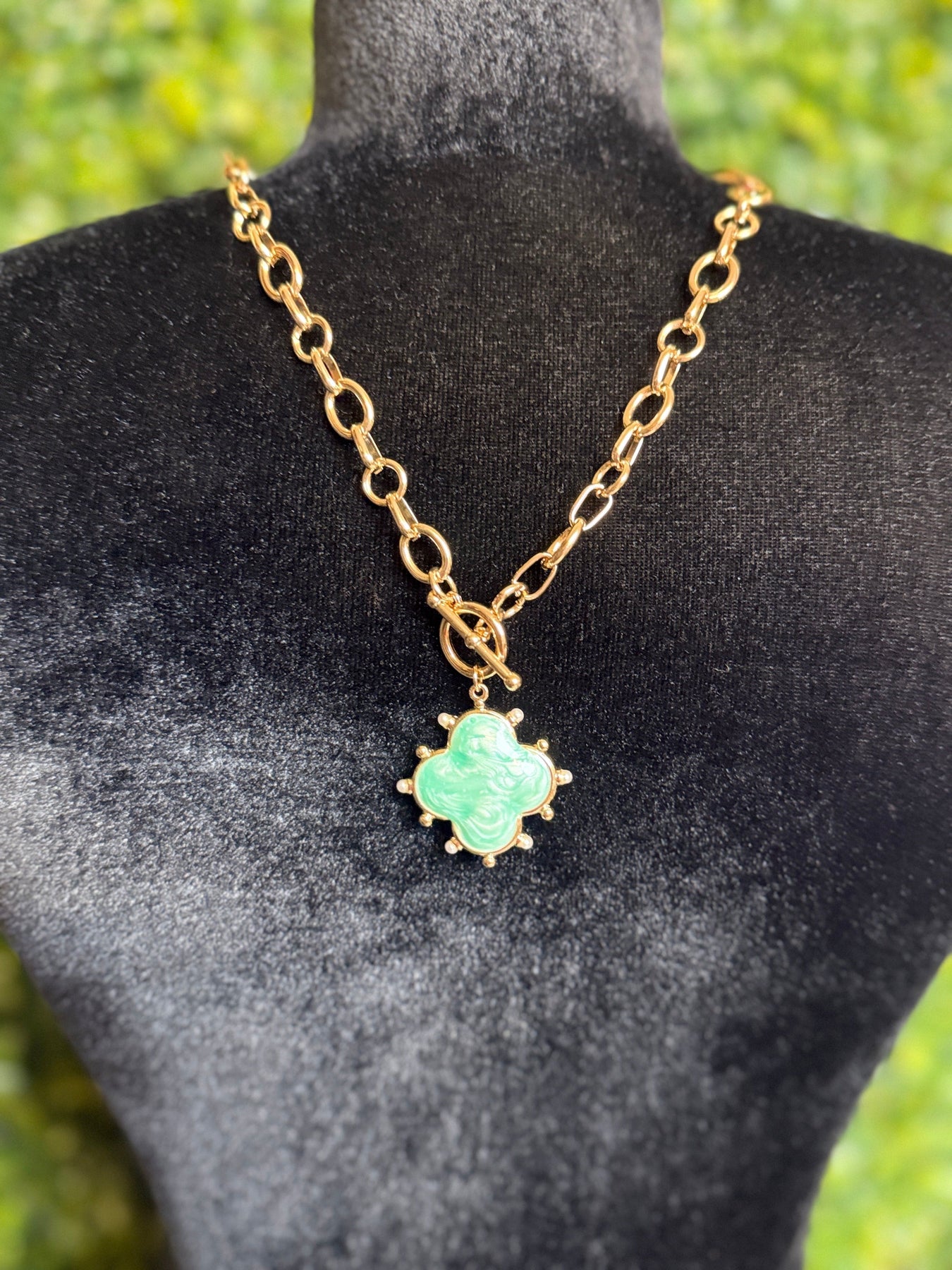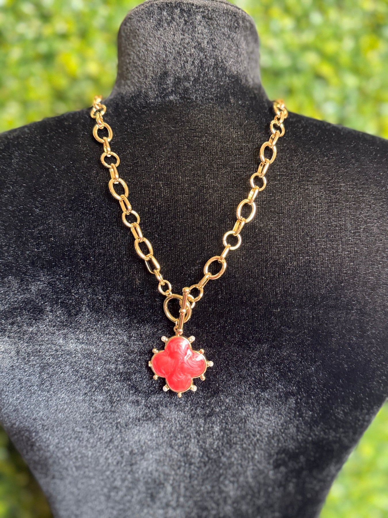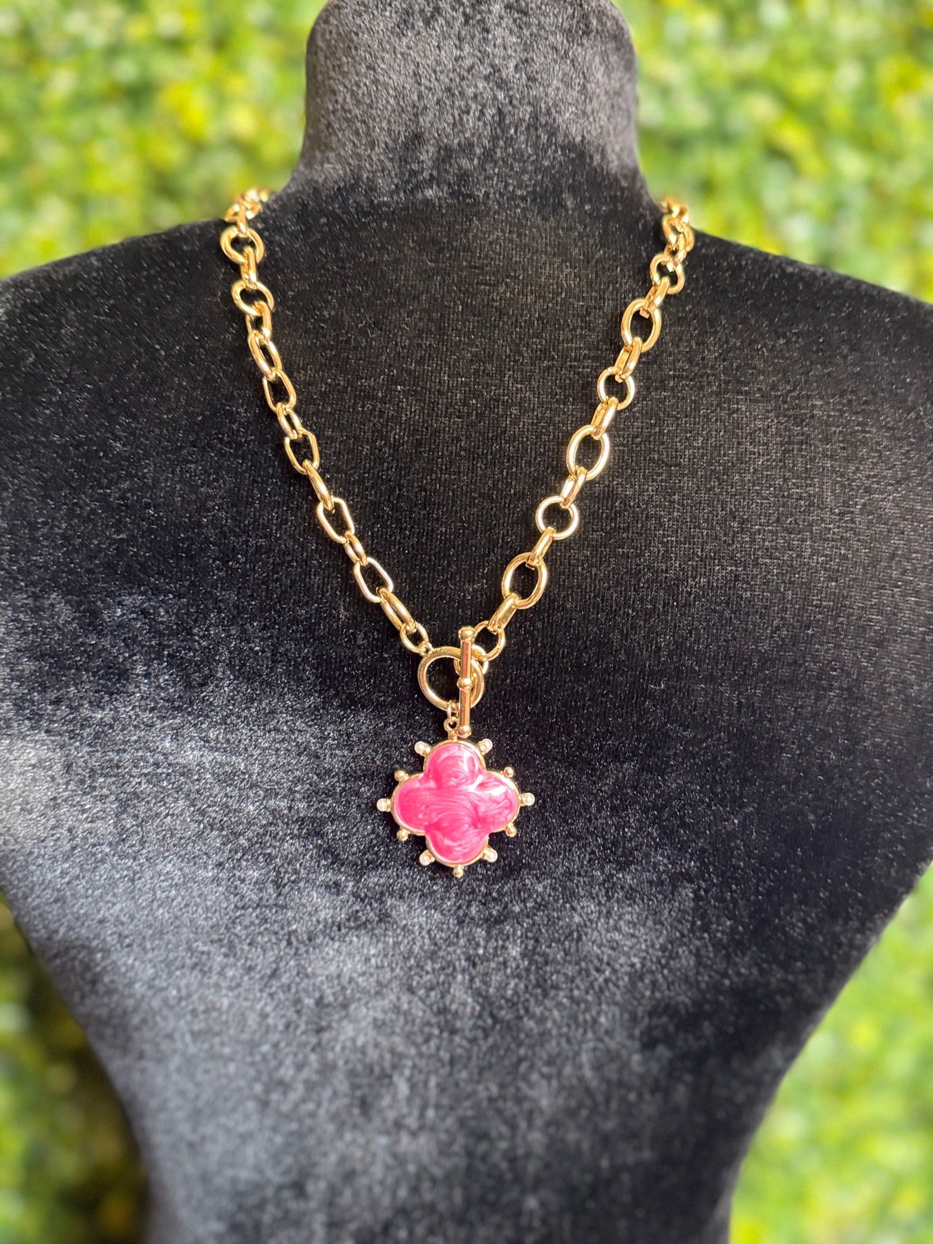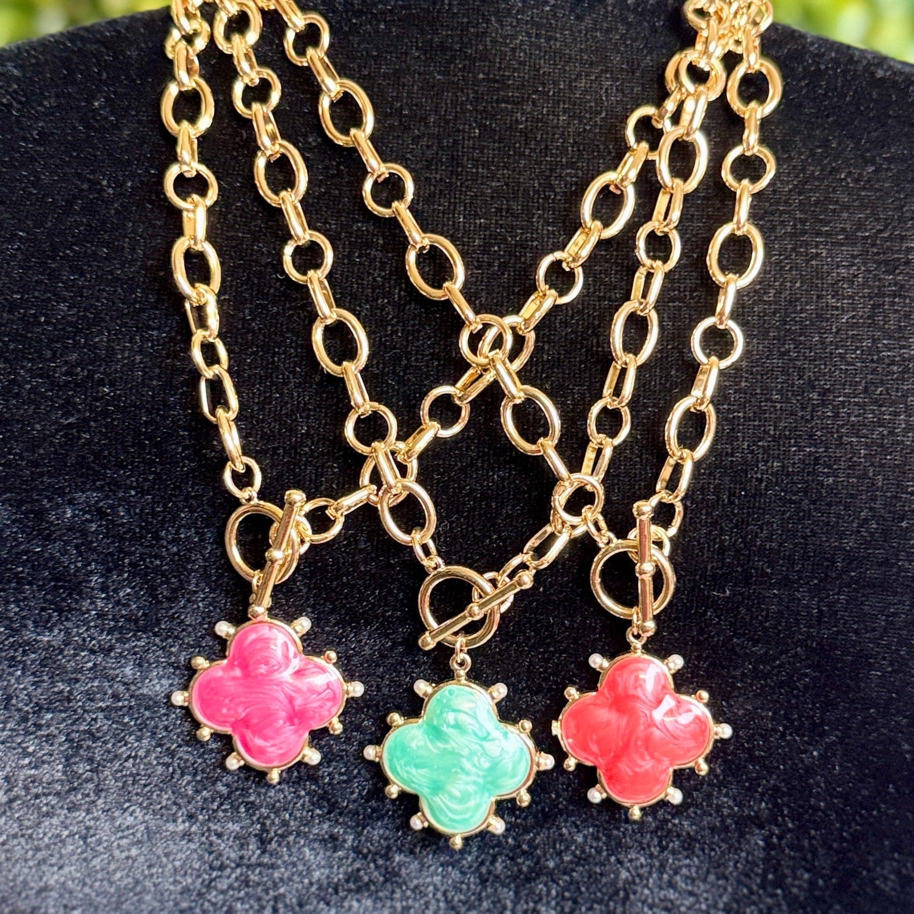 Indulge in the gorgeous Summertime Enamel Quatrefoil Necklace. Adorned with a swirled enamel quatrefoil and accented with some pearls pearls, this necklace exudes sophistication and style. The gold adds a touch of luxury to any look. Elevate your jewelry collection with this must-have piece.