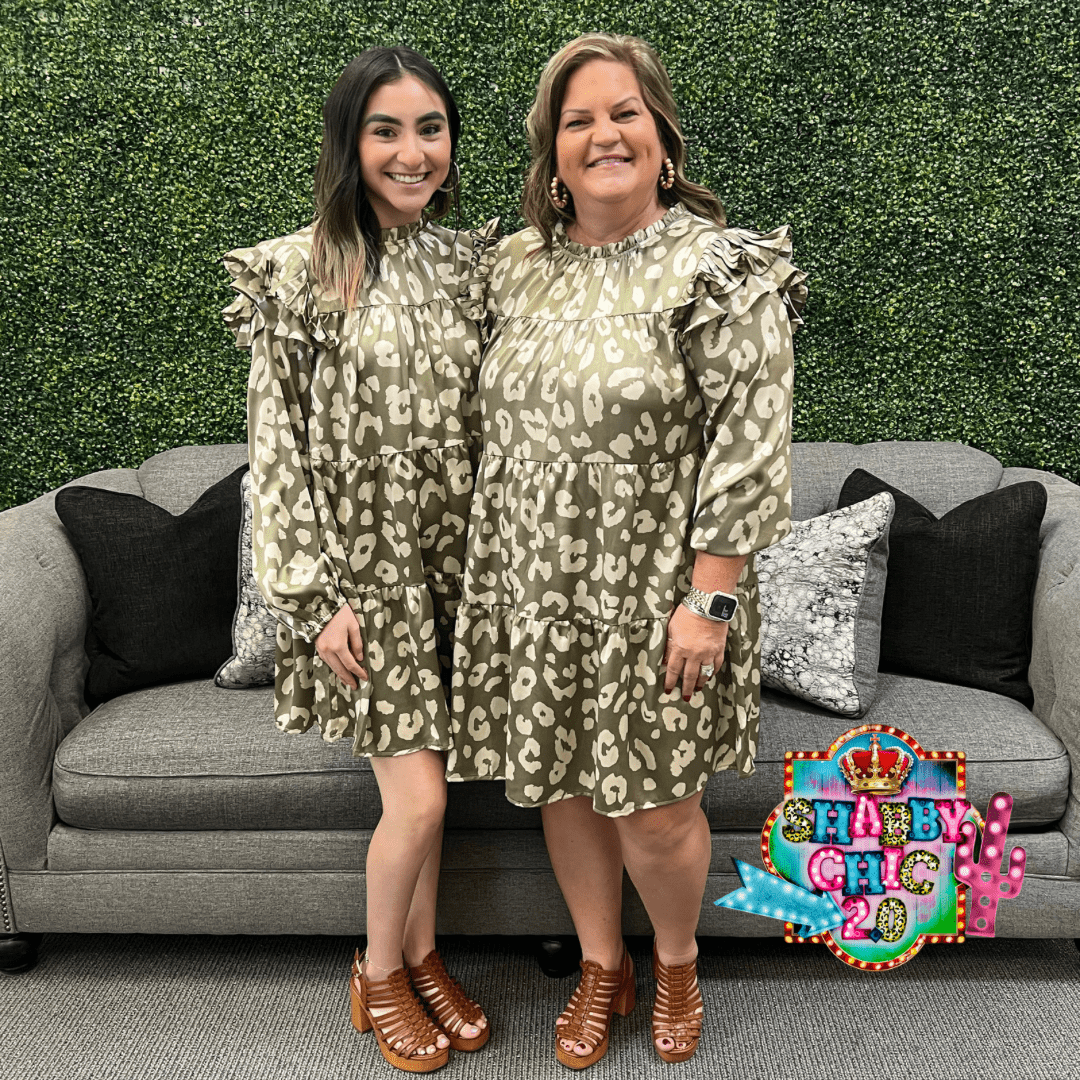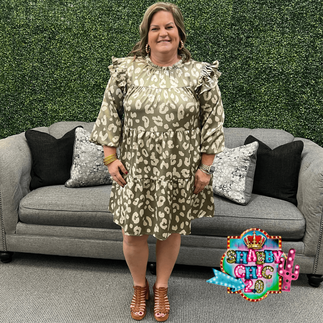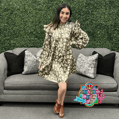 Leopard print tiered dress with a frill mock neckline, layered cap shoulders, and long bubble sleeves. Unlined, non-sheer, lightweight.